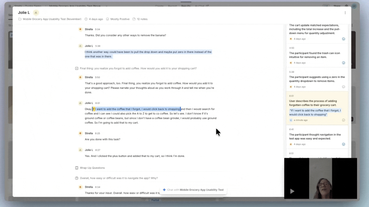 Selecting portions of the transcript is now faster and more fluid, making it easier to create your own interview notes.