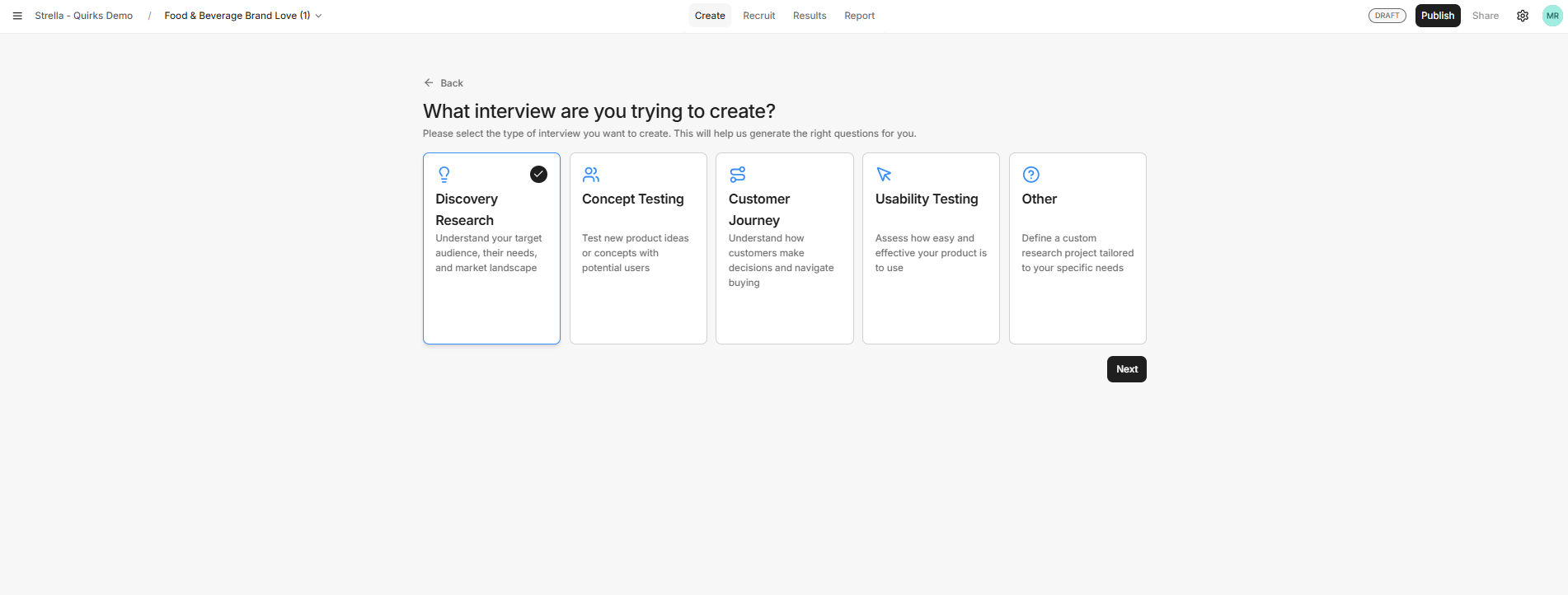 Once you have selected how you want to create your question guide, Strella will draft a structured guide.