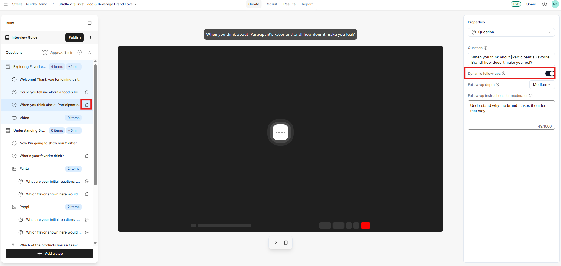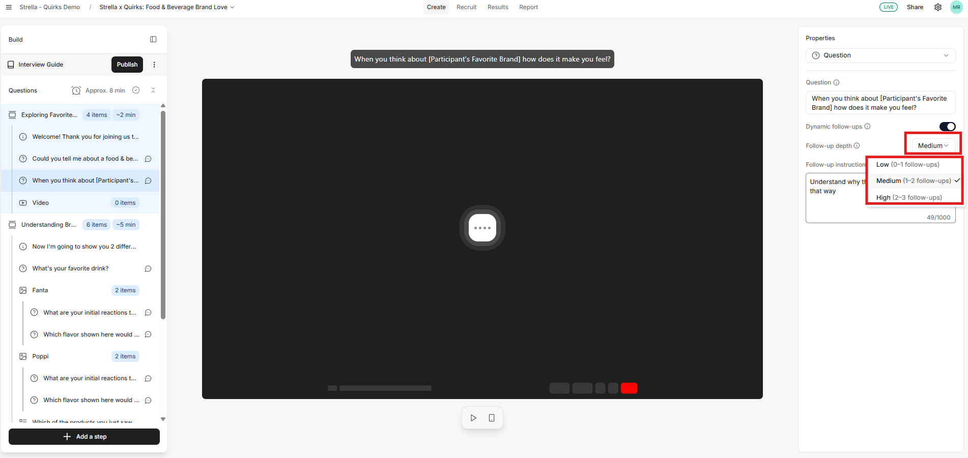 If you choose to have an AI-generated question guide, it will take a guess at which questions are most important to your research goals and automatically turns on dynamic follow up questions.